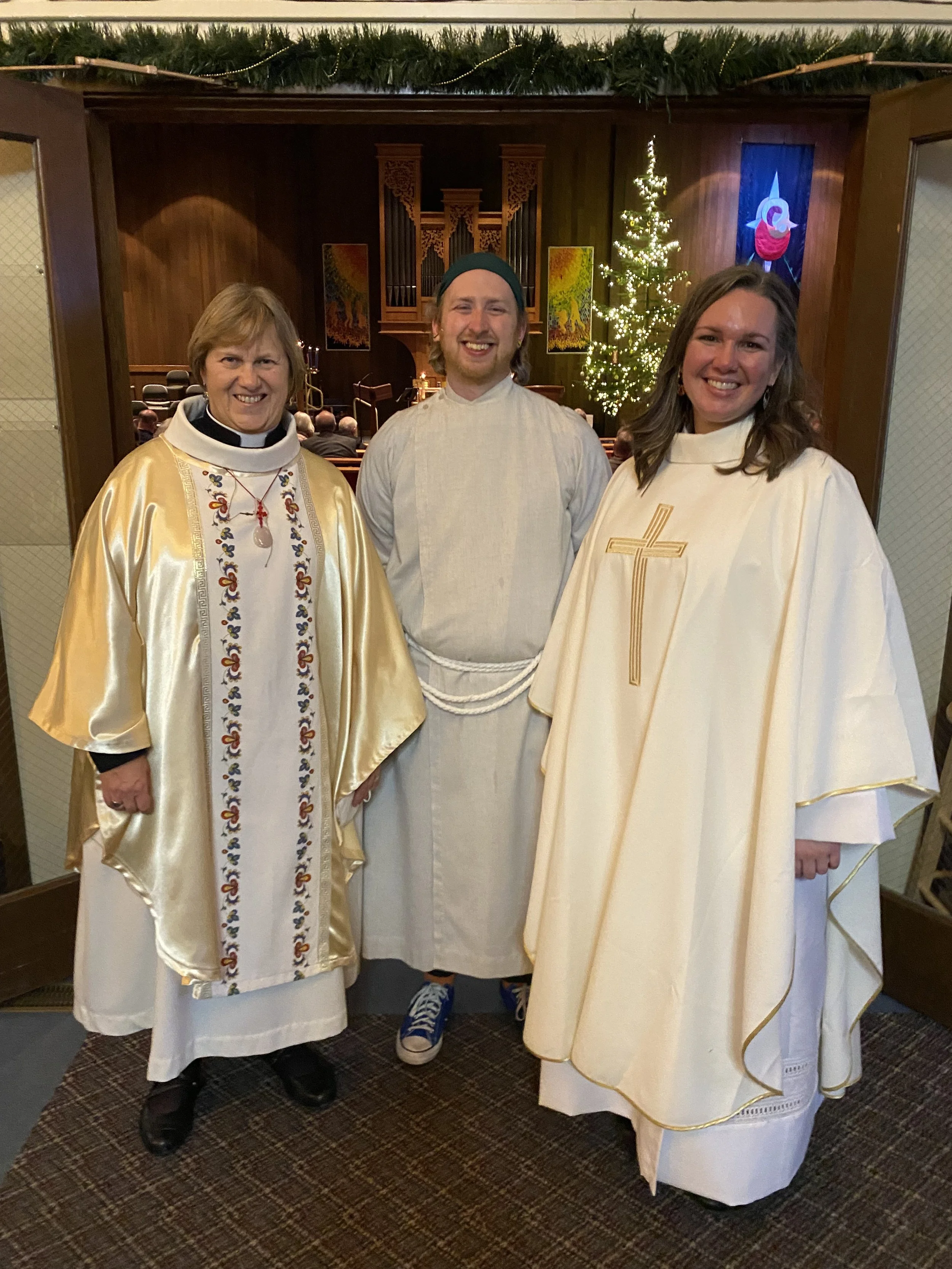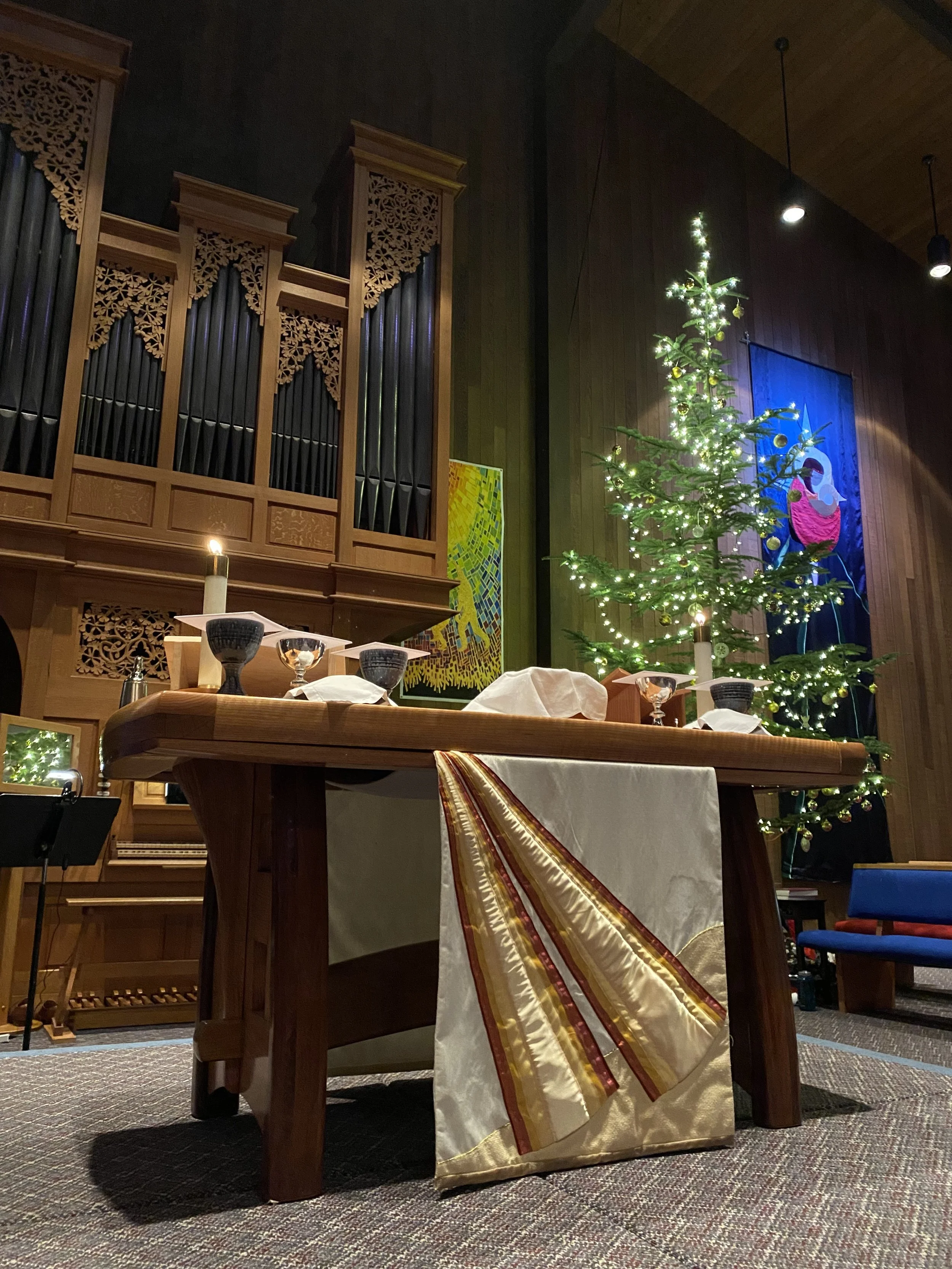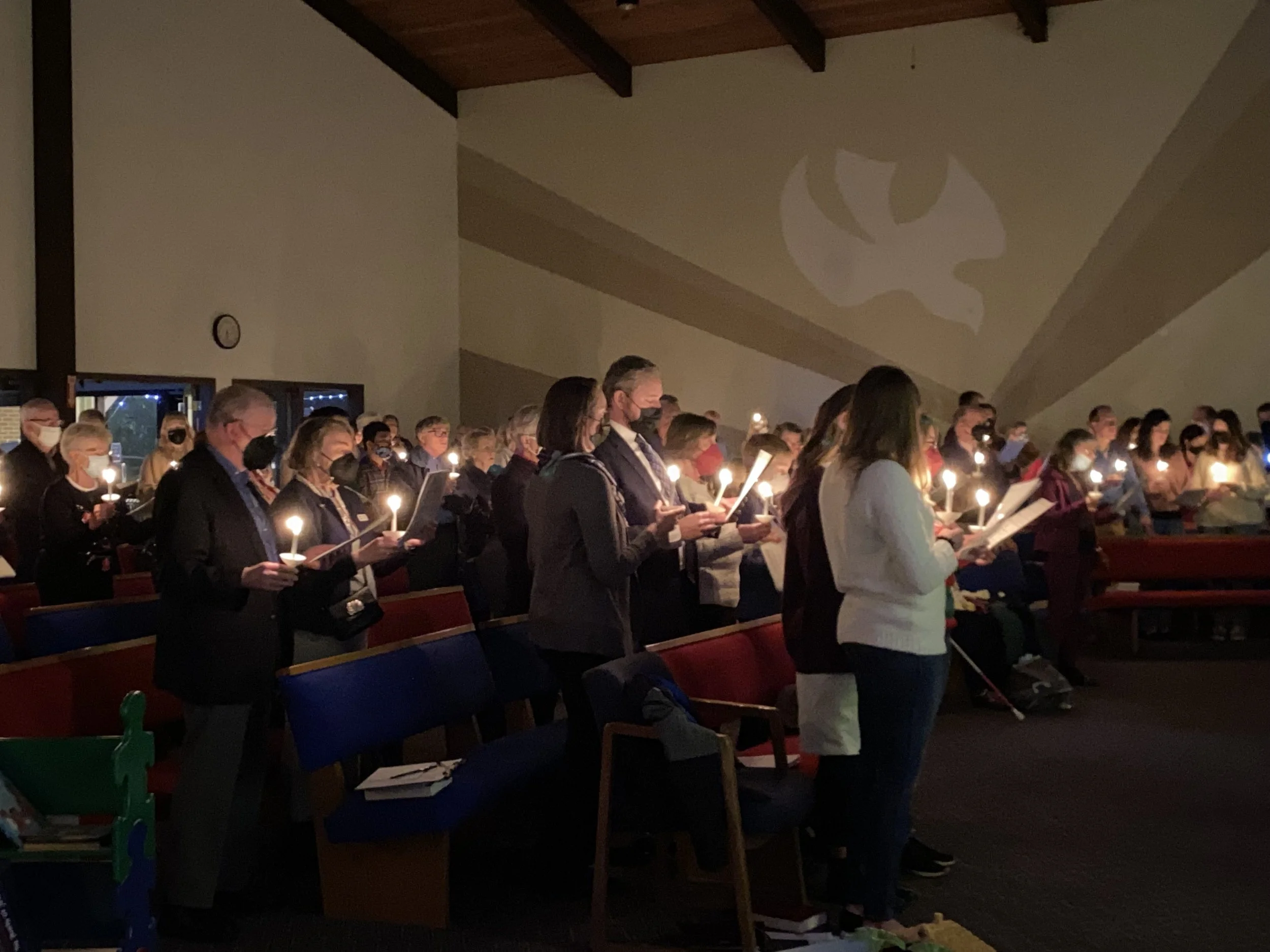 Worship includes Holy Communion, individual candles, and Silent Night. Reflection by Pastor Carol Tomer.