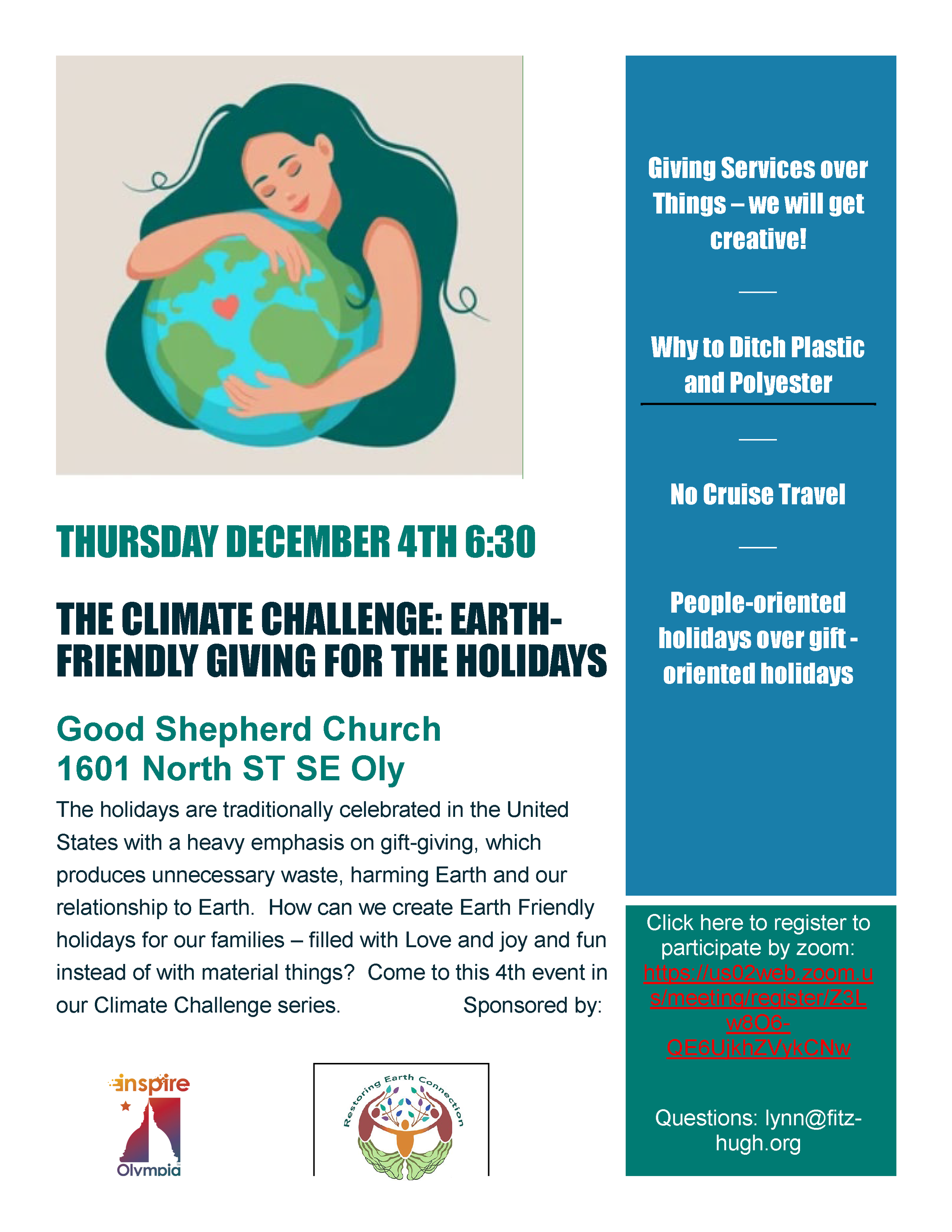 Thursday, Dec. 4, 6:30 at Good Shepherd or by zoom (register at: www.gsolympia.org/cc-zoom). The holidays can be times of high resource consumption. We will discuss earth friendly ways of giving and celebrating, greenhouse reduction goals for the new year and also hear briefly from a speaker about the problems with cruise travel for leisure. We also have time to simply connect with each other around these issues as we are building a community of resilience. Questions: Lynn@fitz-hugh.org.